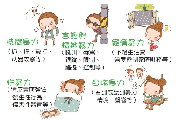性暴力:強迫對方進行性行為、逼迫對方看色情影片或圖片、或其他不適當的性對待等。
